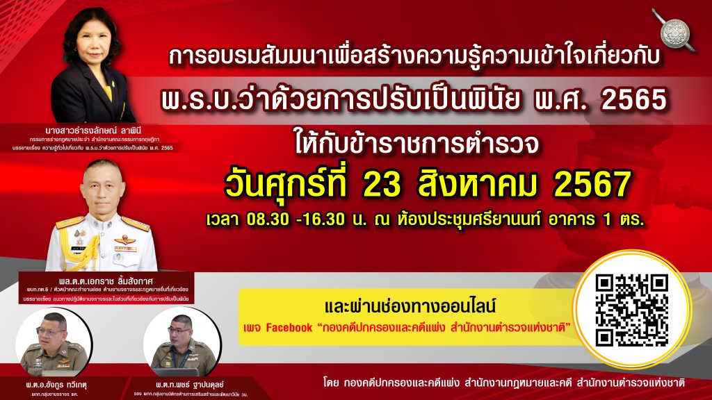 กองคดีปกครองและคดีแพ่ง สำนักงานตำรวจแห่งชาติขอเชิญข้าราชการตำรวจผู้ทำหน้าที่นิติกรของสำนักงานตำรวจแห่งชาติหรือข้าราชการตำรวจผู้ที่สนใจ เข้ารับการอบรม⚖️”กฎหมายปกครองและการดำเนินคดีปกครองสำหรับข้าราชการตำรวจ”⚖️📌โดยวิทยากร ท่านประนัย วณิชชานนท์ ตุลาการศาลปกครองสูงสุดและท่านชัยพล โพธิ์เรือง อัยการผู้เชี่ยวชาญพิเศษ สำนักงานคดีปกครอง