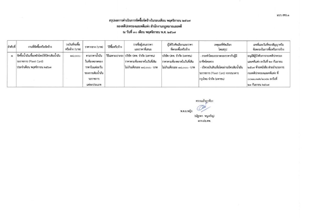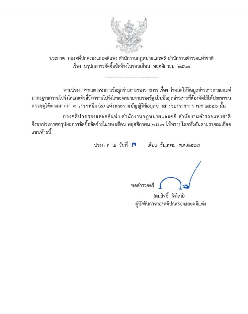 ประกาศ กองคดีปกครองและคดีแพ่ง สำนักงานกฎหมายและคดี สำนักงานตำรวจแห่งชาติ เรื่อง สรุปผลการผลการจัดซื้อจัดจ้างในรอบเดือน พฤศจิกายน ๒๕๖๗